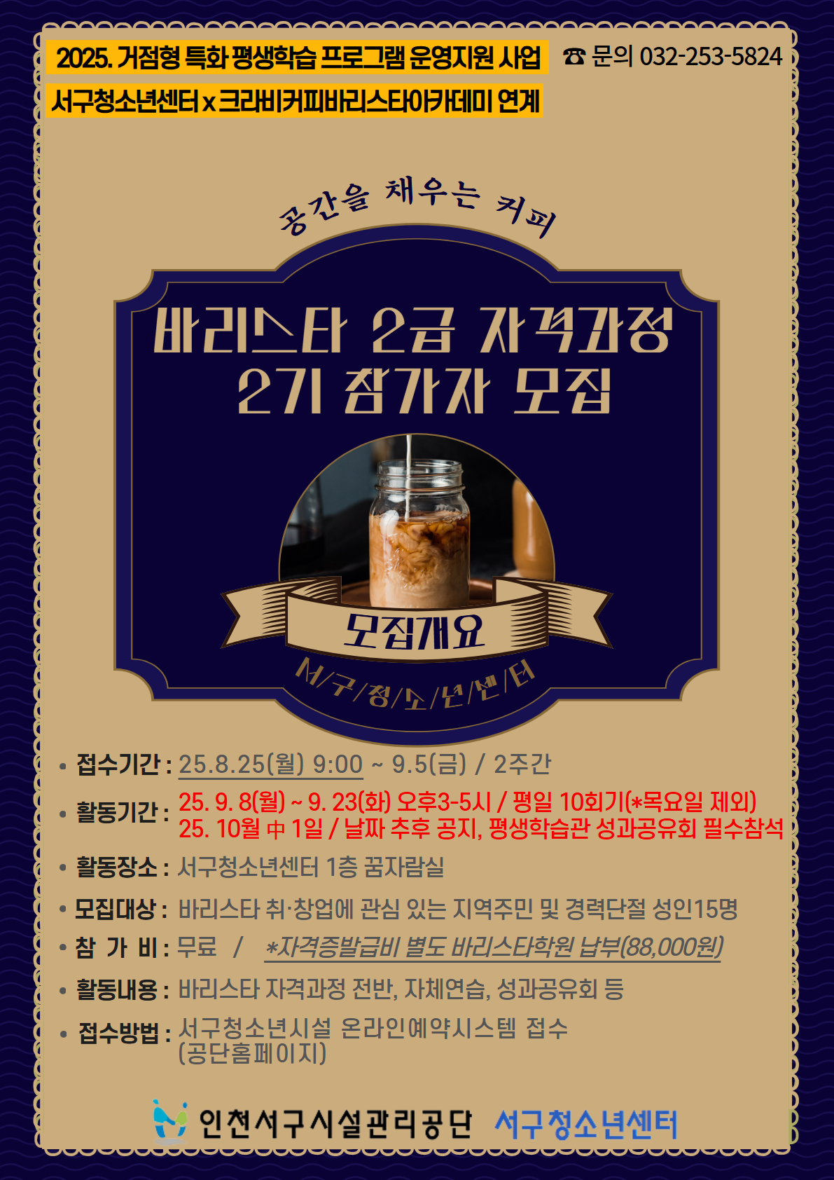 [모집] [거점형 특화 평생학습 프로그램 운영지원사업] 공간을 채우는 커피 - 바리스타 2급 자격과정 2기 참가자 모집