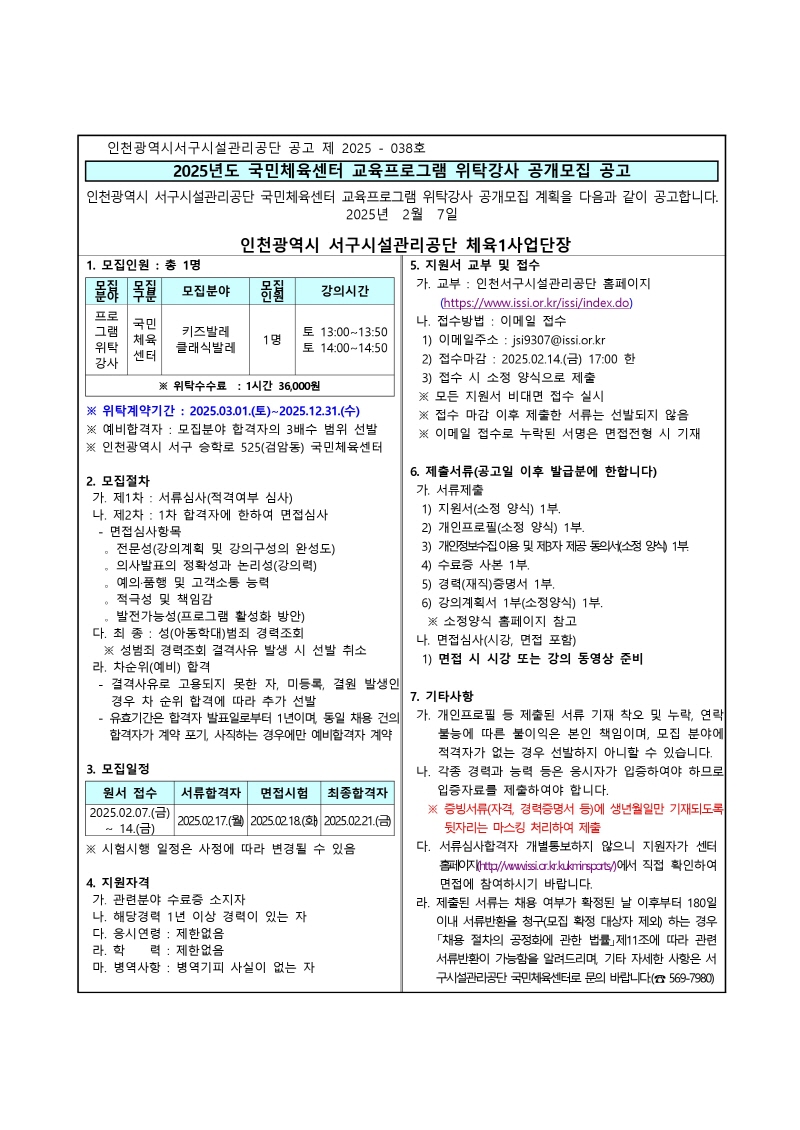 [2025-038] 체육1사업단 국민체육센터 교육프로그램 위탁강사 공개모집 공고