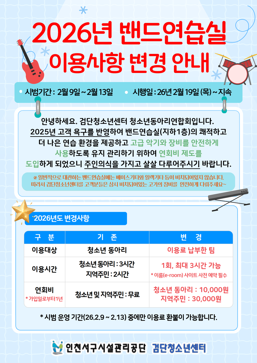[검단청소년센터] 2026. 밴드연습실 이용사항 변경 안내